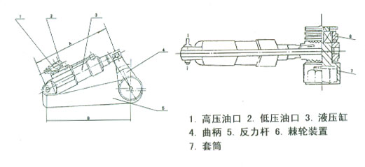 手動高壓泵由操縱手柄,高壓泵、換向閥、油箱、壓力表和帶快速接頭的輸油管等組成。帶棘輪式液壓扳手由高壓油口、液壓油缸、曲柄、反力桿、棘輪裝置、套筒等組成、前者系動力源部件,后者為扭矩執(zhí)行機構。